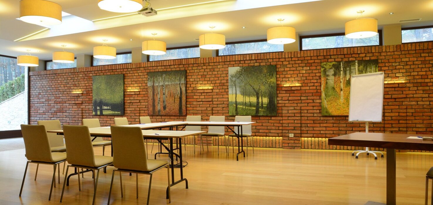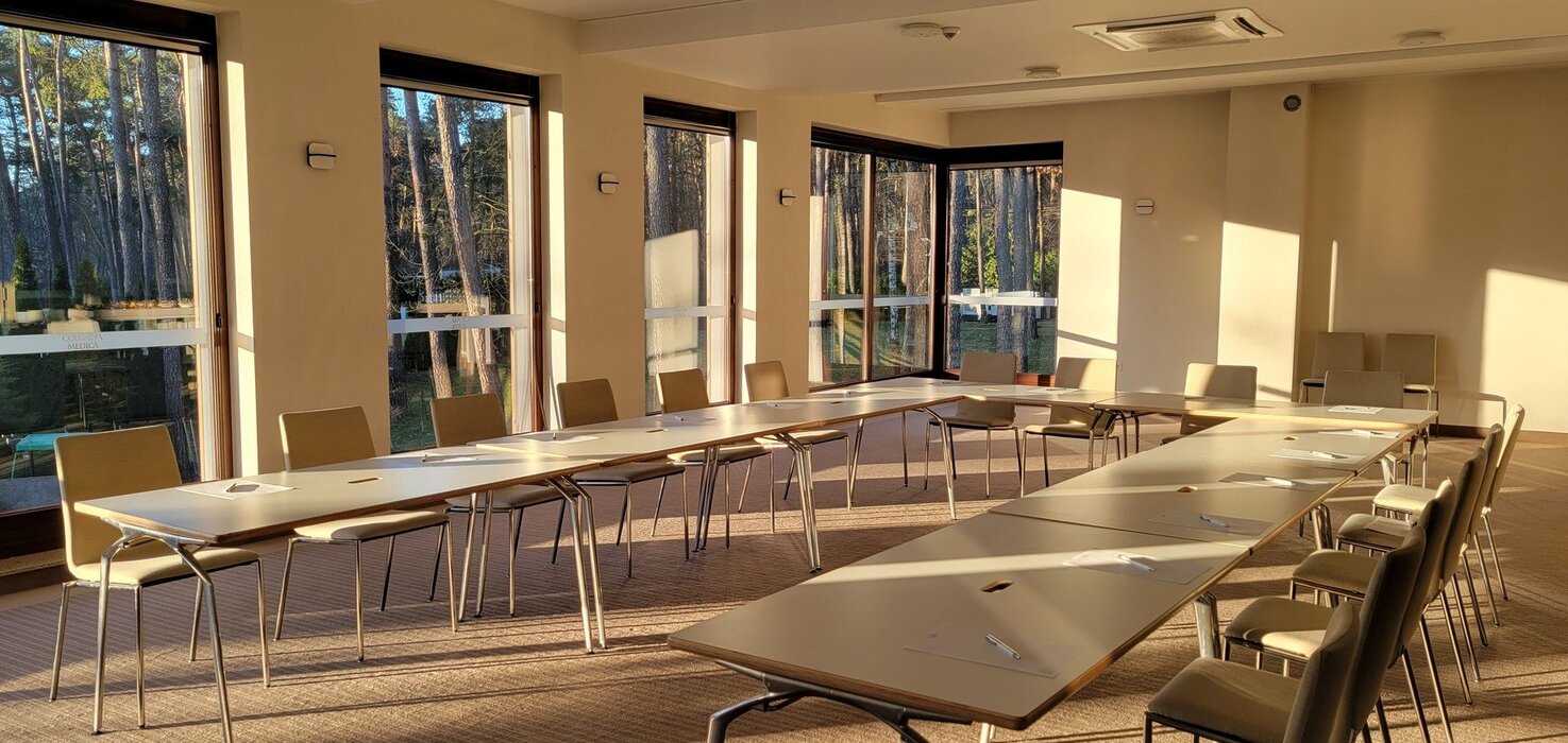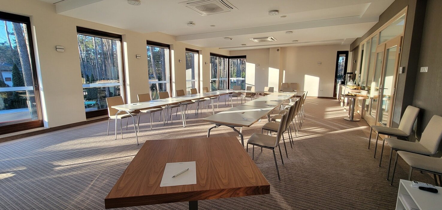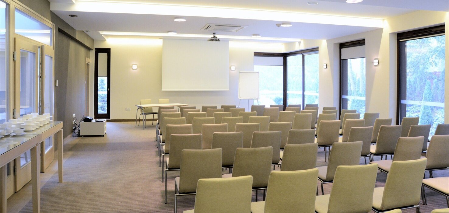 Wyposażenie sali: flipchart z mazakami, rzutnik, ekran, kartki, długopisy, nagłośnienie, mikrofony bezprzewodowe, klimatyzacja, WiFi, dostęp do światła dziennego