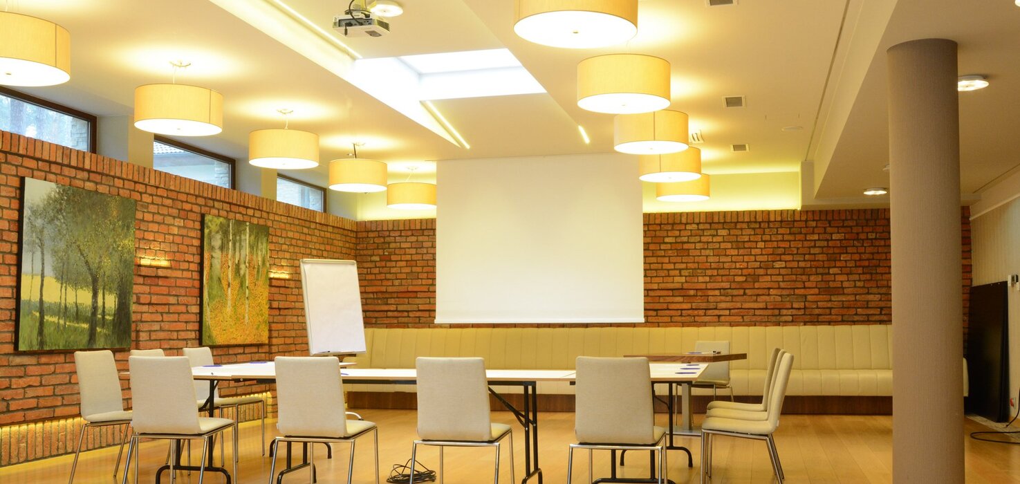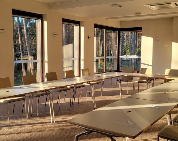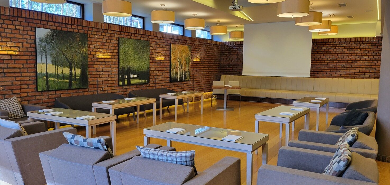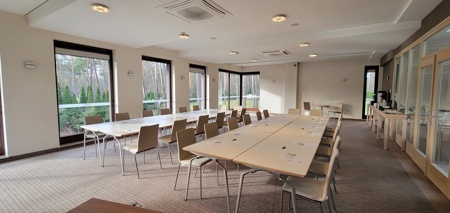 Wyposażenie sali: flipchart z mazakami, rzutnik, ekran, kartki, długopisy, nagłośnienie, mikrofony bezprzewodowe, klimatyzacja, WiFi, dostęp do światła dziennego